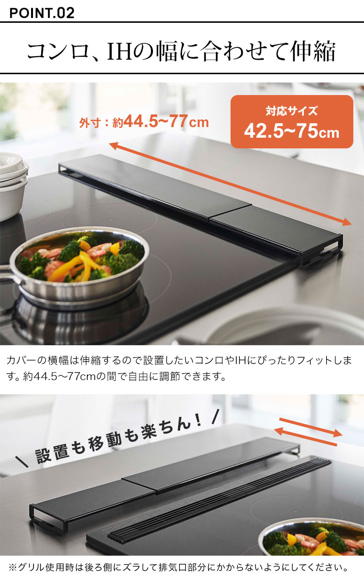 幅は伸縮するので設置するコンロやIHに合わせて調節可能です。