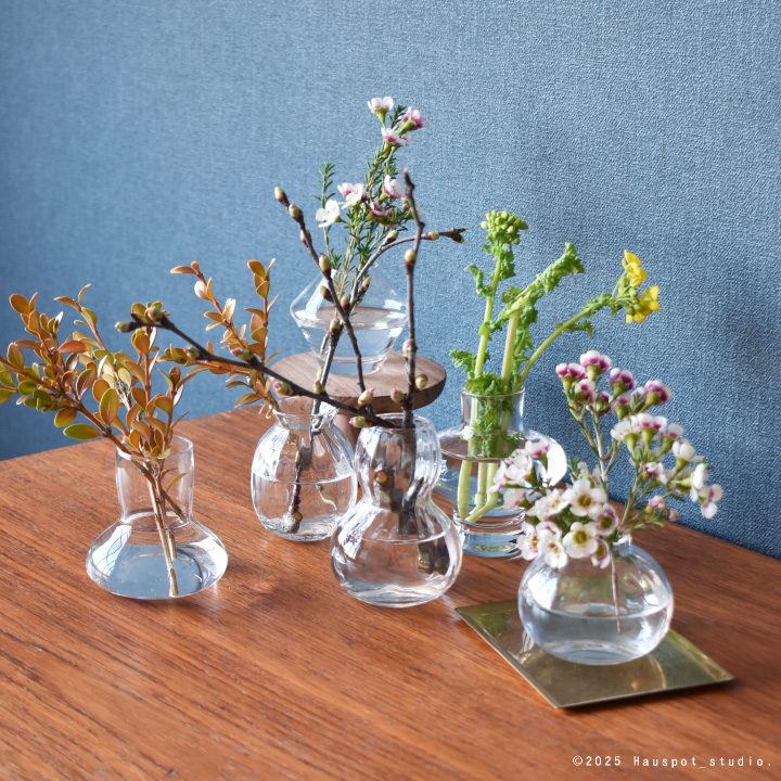 | 少し癖のあるデザインのものが今回追加となりましたが、手のひらサイズゆえに目立ち過ぎず、ひっそりと主張する感じが、かわいらしく思える一輪挿し。 その日の気分、摘んできたお花に合わせて使い分ける楽しさが更に広がりました。 |