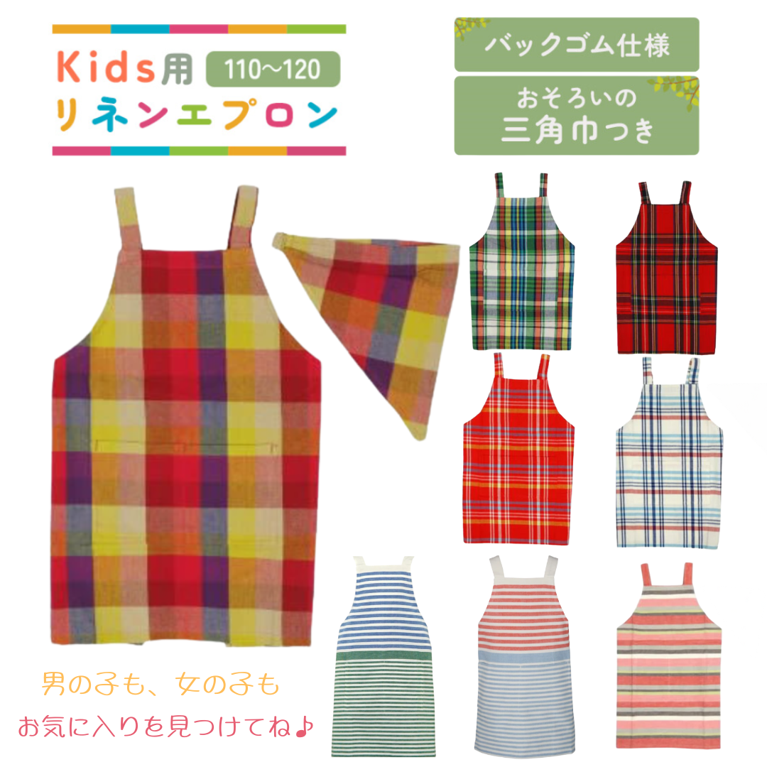 110〜120cmサイズの子供用エプロン。おそろいの三角巾付き!