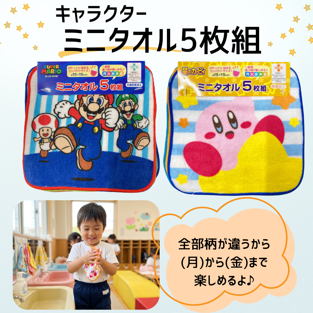 星のカービィ スーパーマリオ ミニタオル 5枚セット ハンカチ タオル 子供 キッズ 男の子 女の子 入園 入学 準備 通園 通学 キャラクター まとめ買い