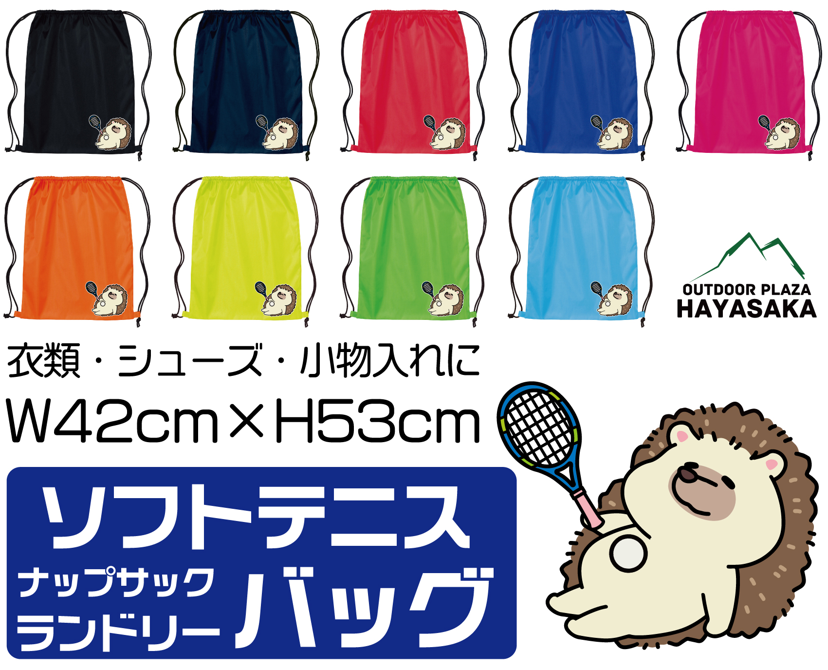 【ソフトテニス】ナップサック ランドリーバッグ マルチ袋 ケース リュック 42cm×53cm【786】【ハリネズミ】【寝そべって ひとやすみ】