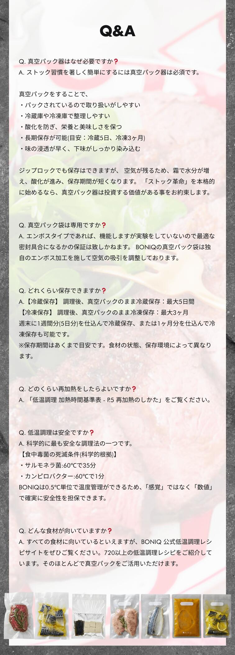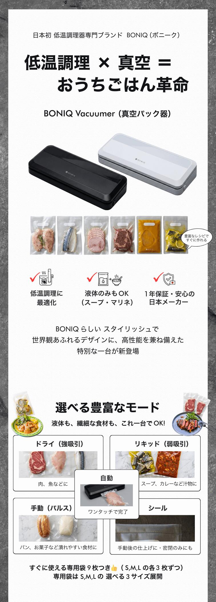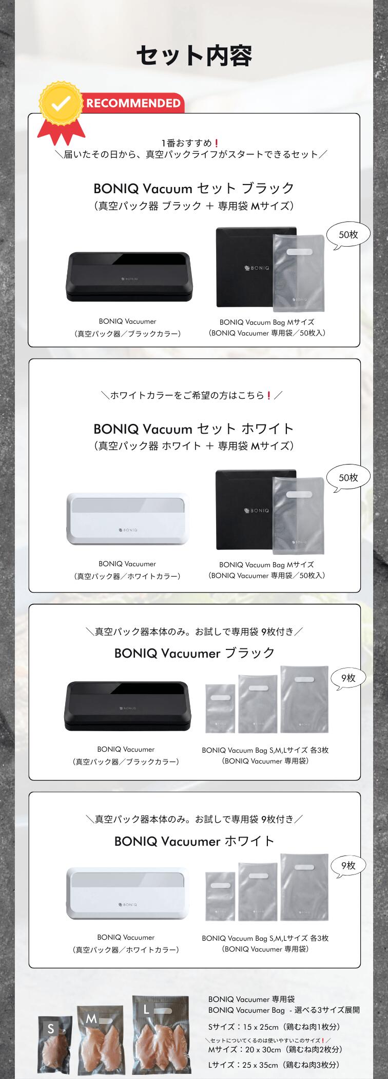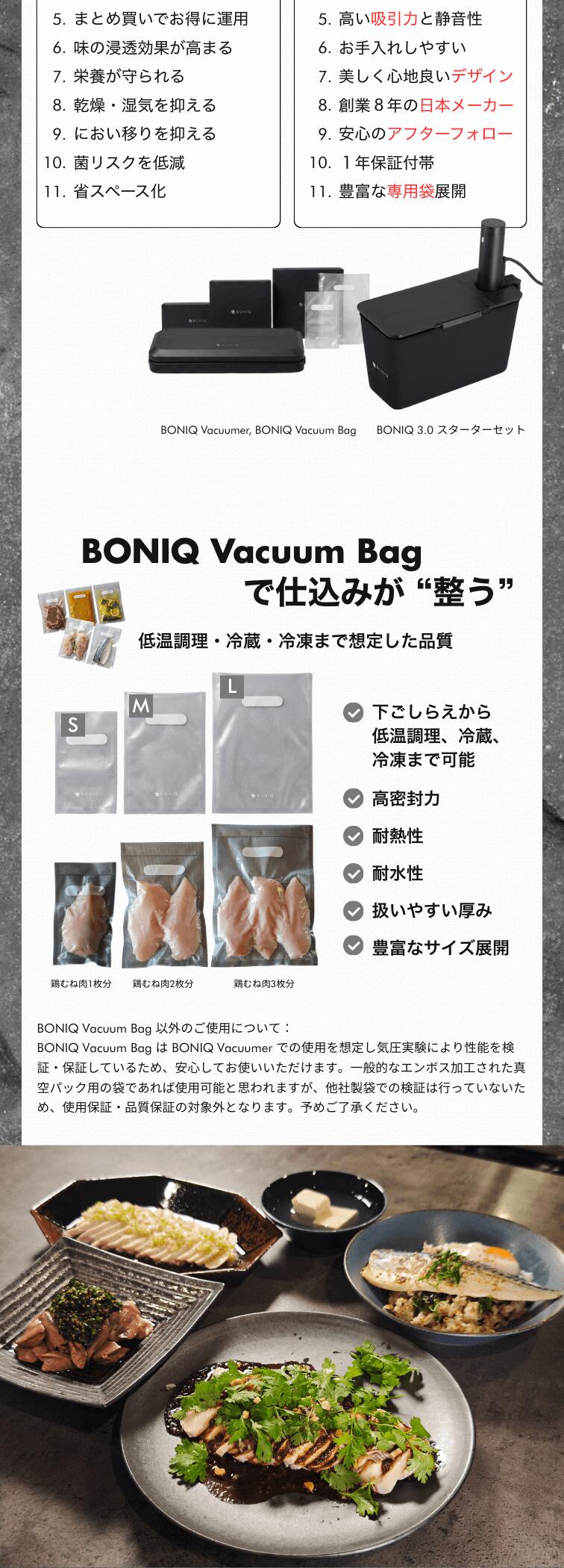 ●豊富な専用袋BONIQ Vacuumer 専用袋「BONIQ Vacuum Bag」低温調理、冷蔵、冷凍までを想定した高品質な専用袋はS、M、Lの3サイズ展開。