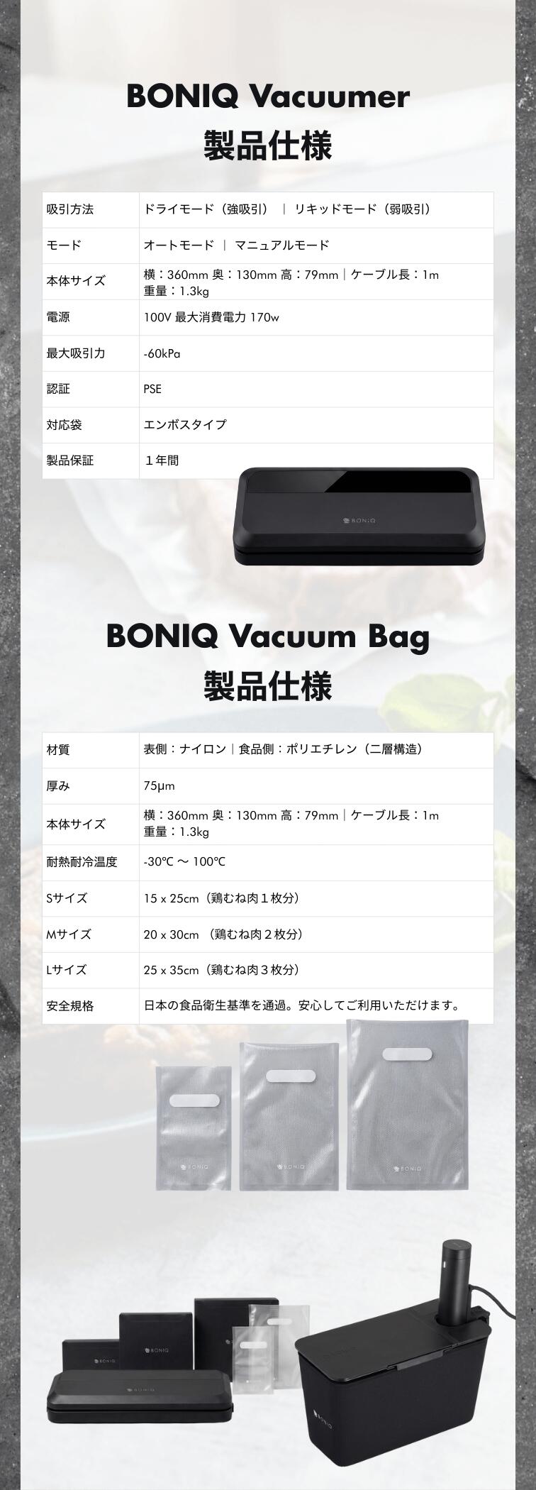 ・付属品:BONIQ Vacuumer 専用袋「BONIQ Vacuum Bag」S,M,L 各3枚(計9枚)、取扱説明書