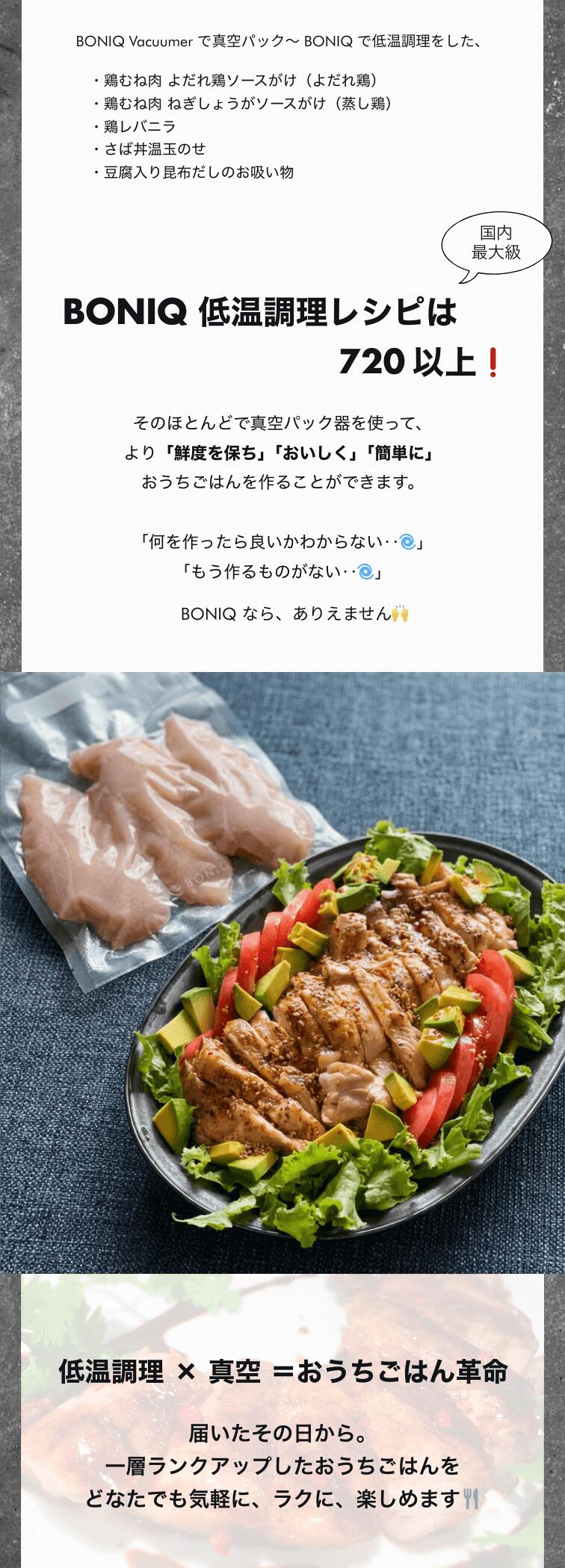 BONIQ 低温調理 ライフで叶える、炭水化物中心から、タンパク質中心のヘルシーでHAPPYな食習慣。