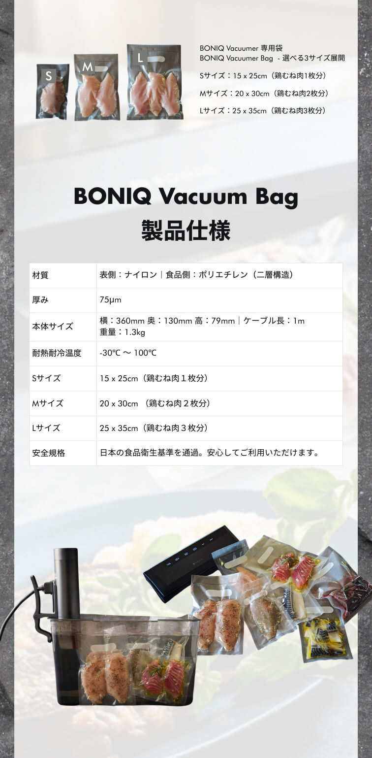 ●豊富なサイズ展開BONIQ Vacuum BagはS、M、Lの3サイズ展開。食材や料理に応じて選べます。