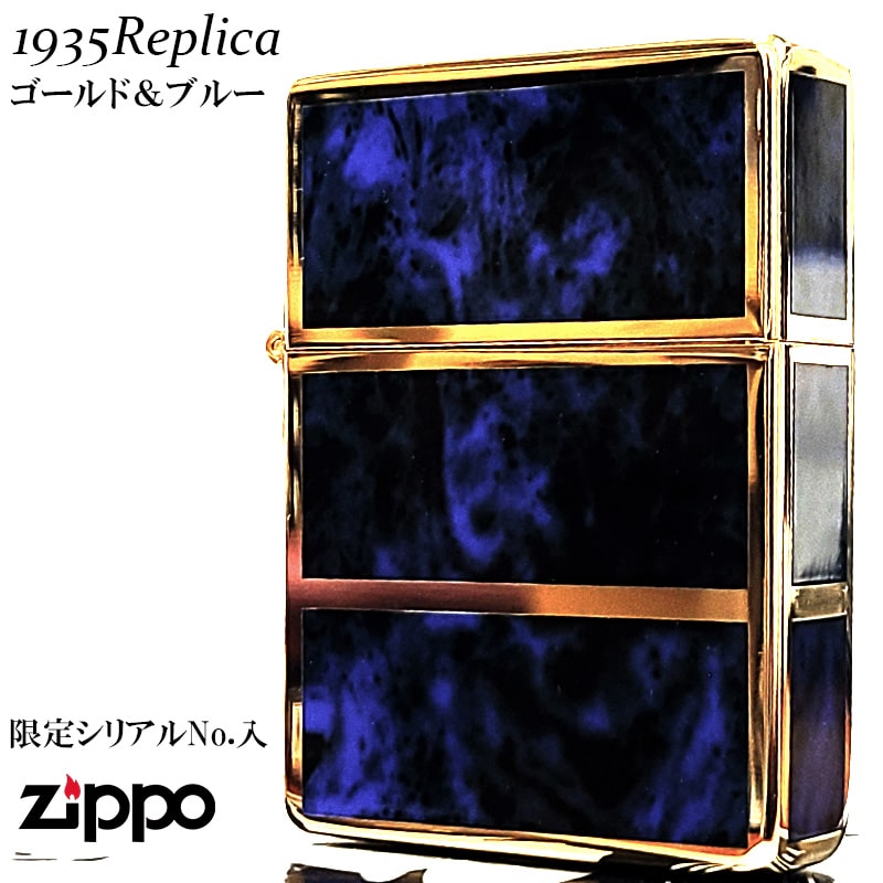 ZIPPO ライター 限定 1935 復刻レプリカ ジッポー ゴールド&ブルー かっこいい 4面加工 シリアルナンバー入り 角型 3バレル