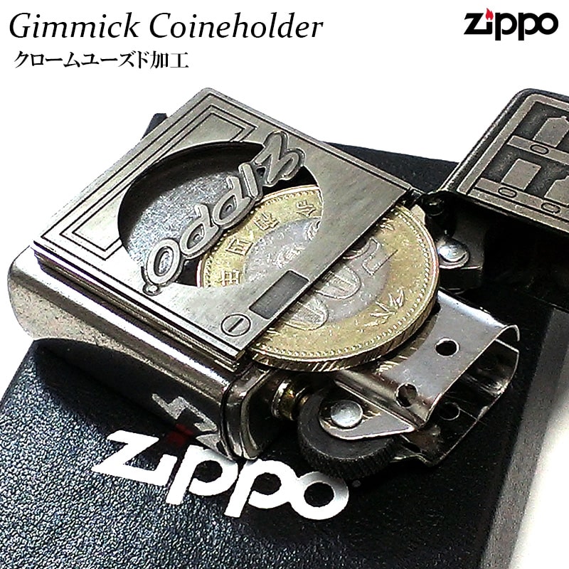 ZIPPO ライター コインホルダー 面白い ジッポ ギミック クロームユーズド加工 500円 ロゴ 彫刻 メタル貼り アンティークシルバー