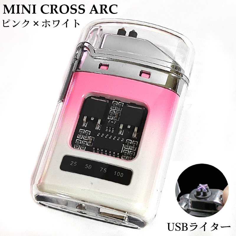 USBライター ミニクロスアーク ピンク×ホワイト オイル ガス 不要 エコ 充電式ライター ハイテク スケルトン 電池残量表示機能