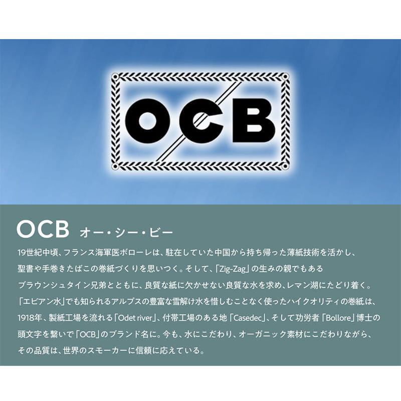 「エビアン水」でも知られるアルプスの豊富な雪解け水を惜しむことなく使ったハイクオリティの巻紙.は、1918年、製紙工場を流れる「Odet river」、付帯工場のある地「Casedec」、そして功労者「Bollore」博士の頭文字を繋いで「OCB」のブランド名に。 今も、水にこだわり、オーガニック素材にこだわりながら、その品質は、世界のスモーカーに信頼に応えている。