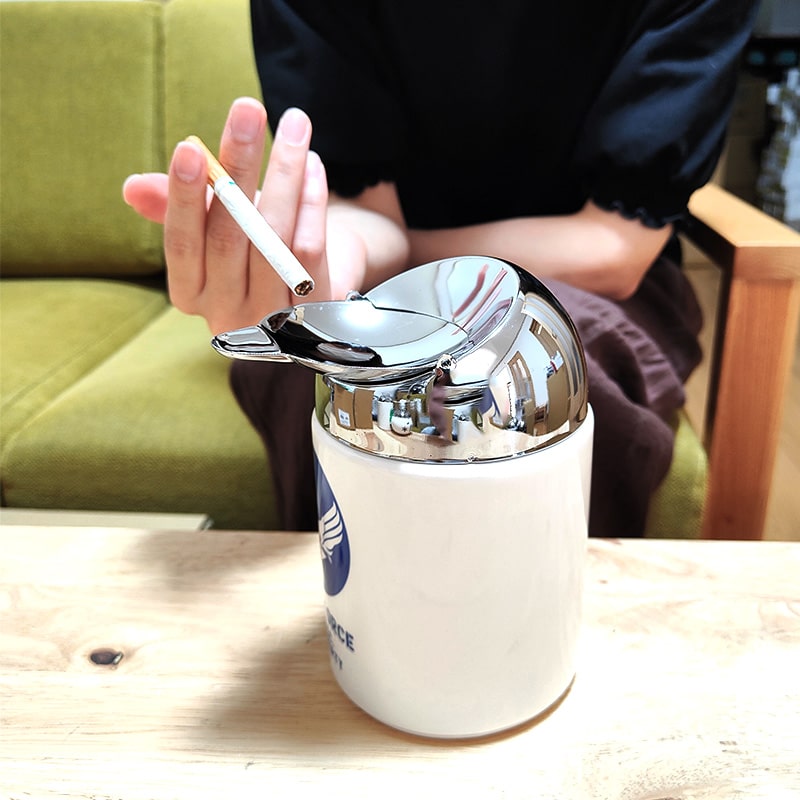 蓋が半回転してレストになり、蓋を戻せば中に吸い殻や灰が落ちる仕組みです。風で燃えかすが飛んだりする心配もなく安心してお使いいただけます。