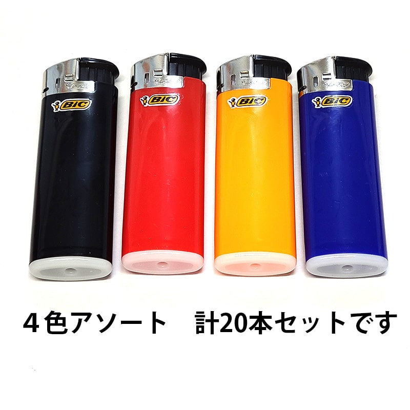 BICライター 20本セット J38 電子式 使い切り ガスライター 可愛い 4色入り ブラック レッド イエロー ブルー 使い捨て たばこ 屋外 箱入り