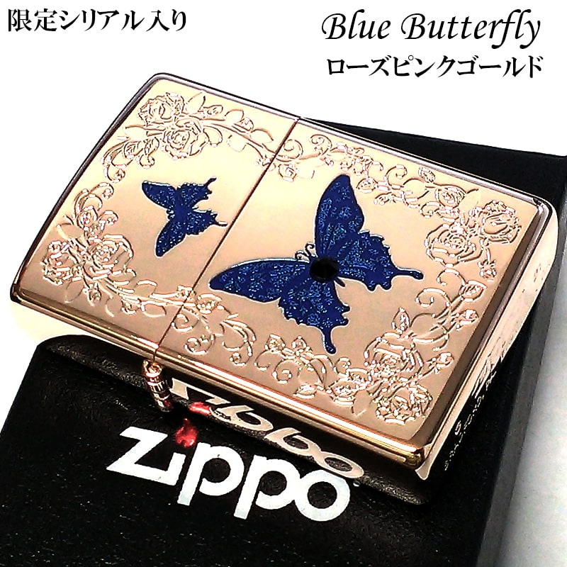 ZIPPO 限定 ブルーバタフライ ローズ ピンク ジッポ ライター シリアルNo入り 蝶 かわいい スワロフスキー 蝶々 両面加工 美しい バラ