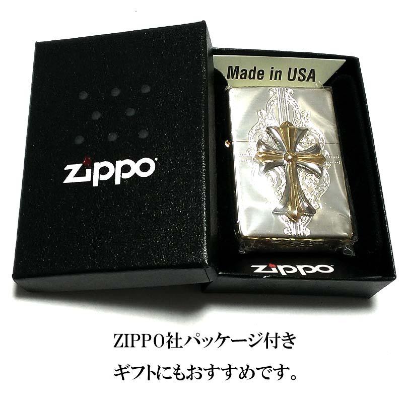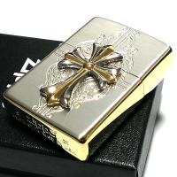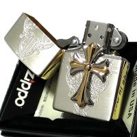 ZIPPO ライター クロスメタル ジッポ サイドゴールド 金銀コンビメタル 金差し シルバーサテン 十字架 彫刻 銀 かっこいい おしゃれ