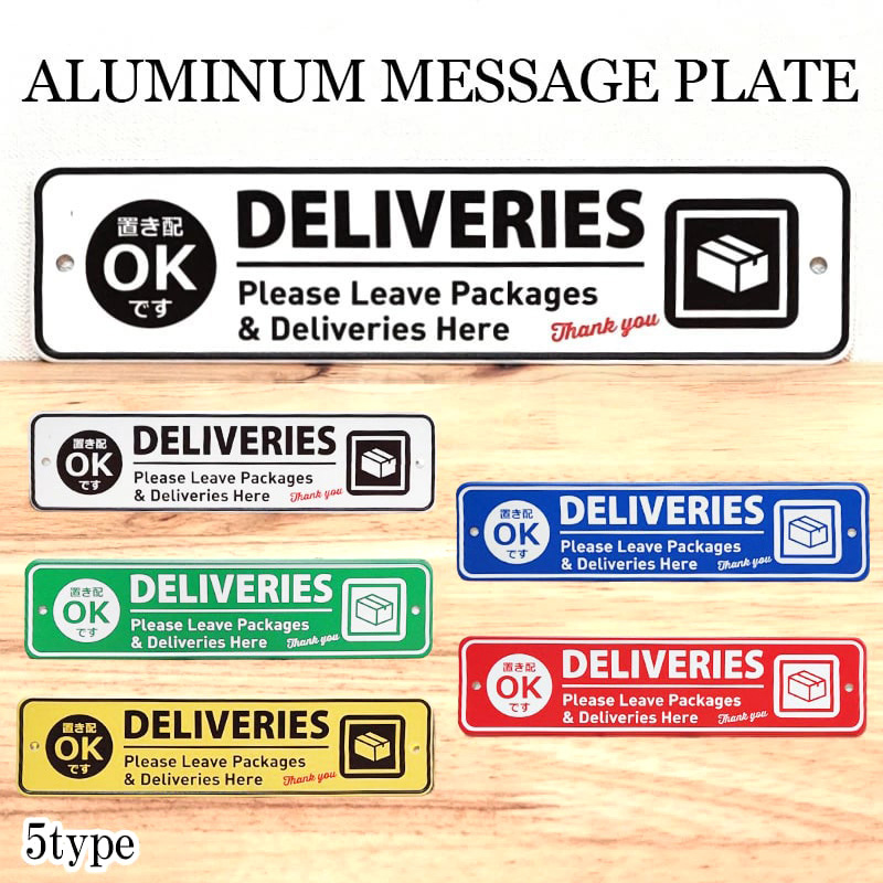 看板 置き配OK 宅配便 かわいい プレート アルミニウム DELIVERIES メッセージサイン ホワイト レッド ブルー イエロー グリーン おしゃれ