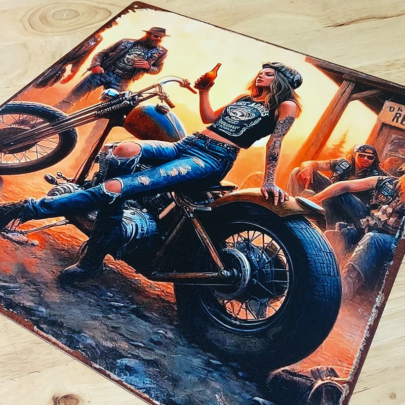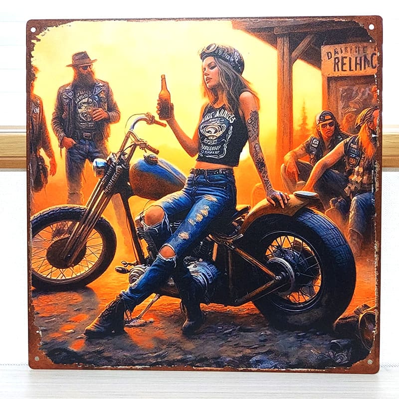 アメリカンカルチャーの中でもひときわ輝く、女性ライダーのスピリットを描いたメタルプレート。