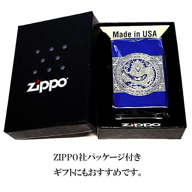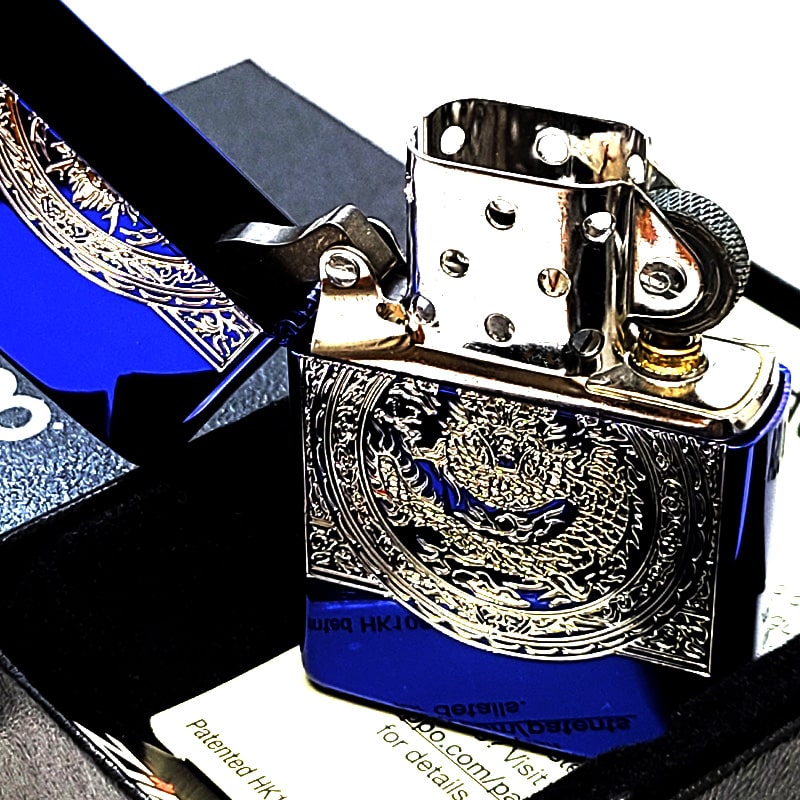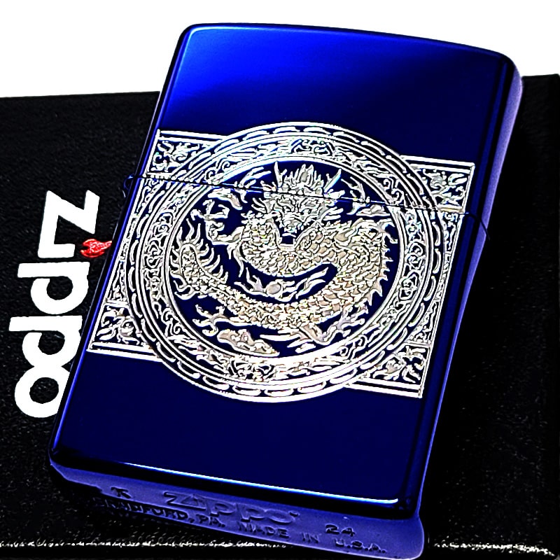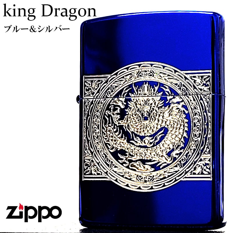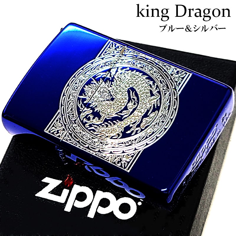 ZIPPO ライター 龍 おしゃれ キングドラゴン ジッポ 彫刻 イオンブルー&シルバー 銀差し 和柄 龍 青 竜 メンズ プレゼント ギフト