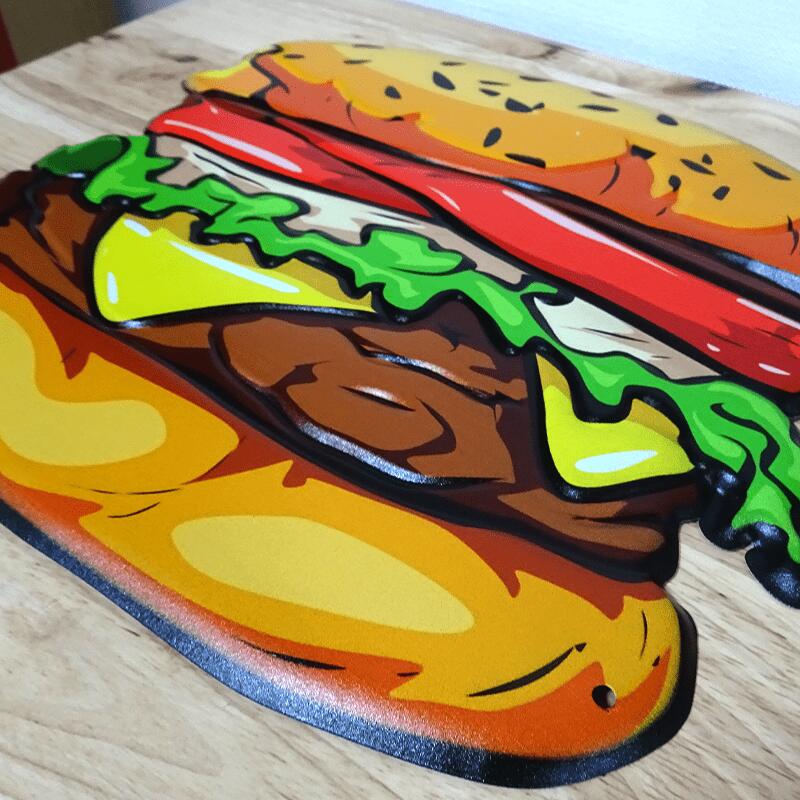 ボリュームたっぷりの美味しそうなリアルなチーズバーガーのブリキ看板!