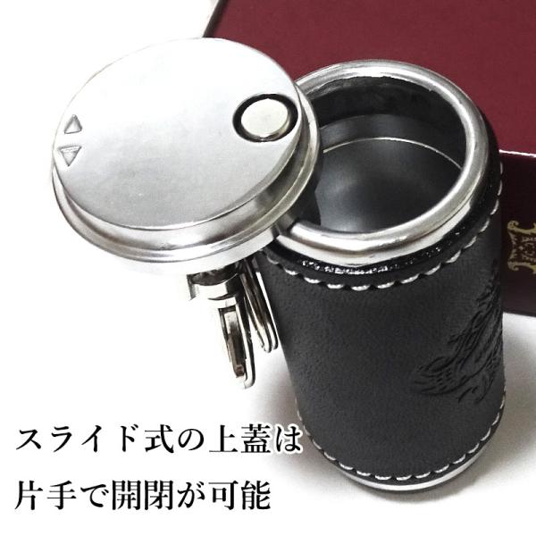 アルミダイキャストにレザーを組み合わせたこちらの携帯灰皿は、スマートなフォルムの中にも革のぬくもりを感じさせる大人の佇まい。親指一本で蓋をスライドさせることが出来るので、片手での開閉も簡単。