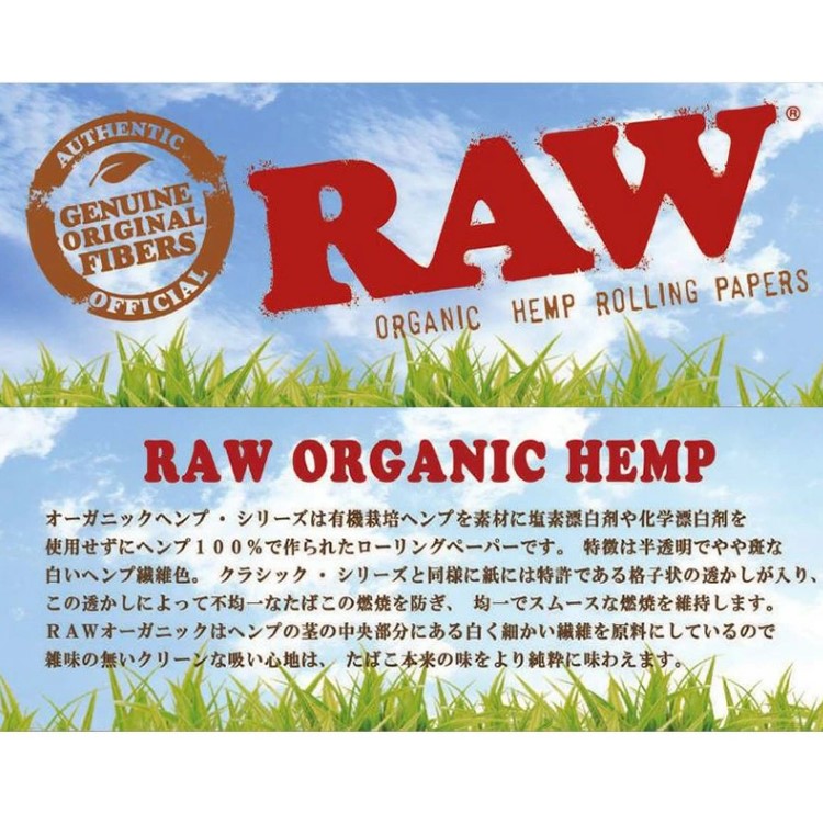 RAWのオーガニックシリーズは、塩素漂白剤不使用、有機栽培のヘンプ100%で作られた紙と、その紙と同等の燃焼速度を持つヘンプ配合のナチュラルガムでできています。