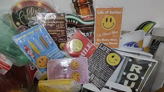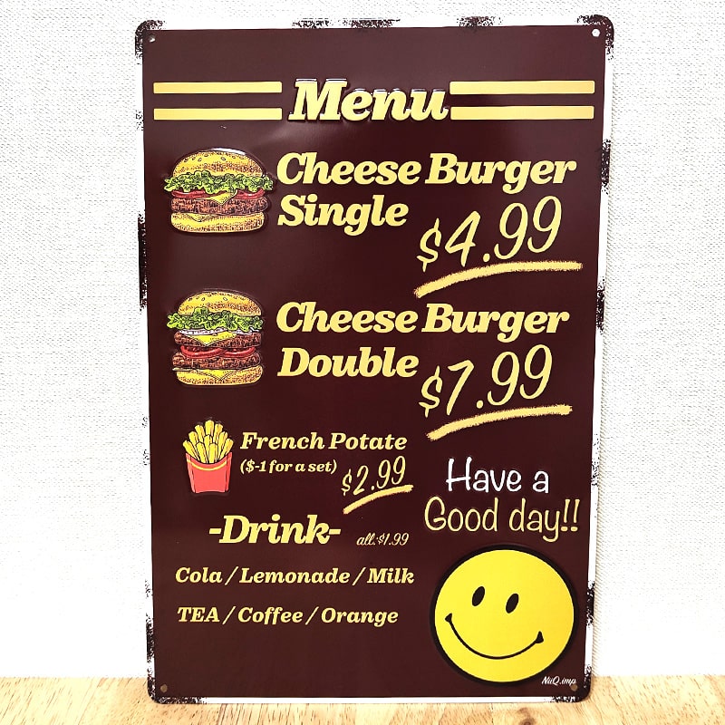 まるでハンバーガーショップのメニュー表のようなスマイルのかわいいブリキ看板です。
