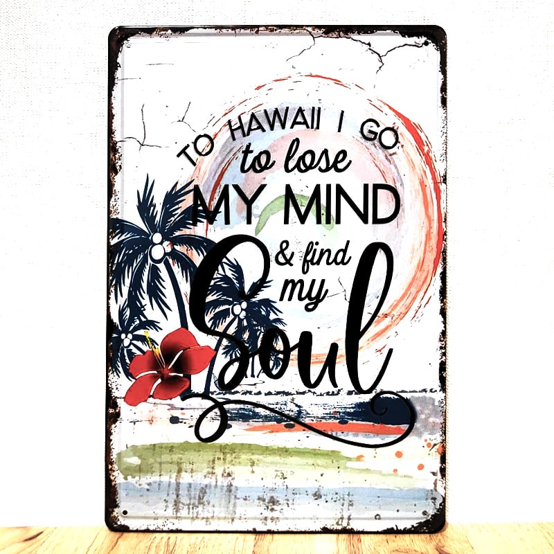 「FIND MY SOUL」と書かれたハワイアンなデザインのブリキ看板です。