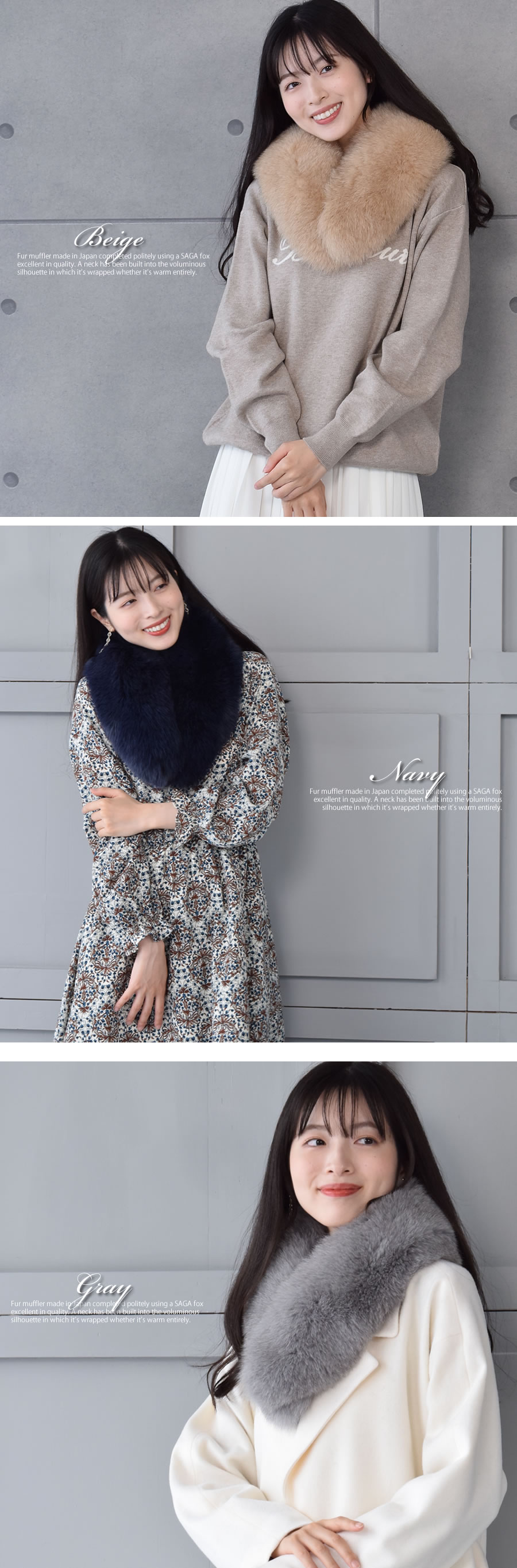 安心と信頼・確かな品質、ファーの最高級品質を誇るブランド「SAGA FUR」をたっぷり使用したファーマフラー。襟元をすっぽりと暖かく包み込むボリューミィなフォックスマフラーです。柔らかな手触りとリッチな艶感が自慢のファーマフラーは、カジュアルからドレッシースタイルまでふんわり巻くだけでニュアンスが生まれ、着こなしにリッチさをプラス。マフラーの先端にカギホックと両端にクリップが付いているので、スタイルに合わせて巻き方に変化をつけることができます。落ち着いたカラーとラウ ンド型のシルエットは、和装・洋装どちらにも使えます。お手持ちのコートの襟にクリップで挟めば、フォックストリムコートに簡単チェンジ!!豊富なカラーバリエーションで秋冬ファッションに似合う人気の11色展開。
