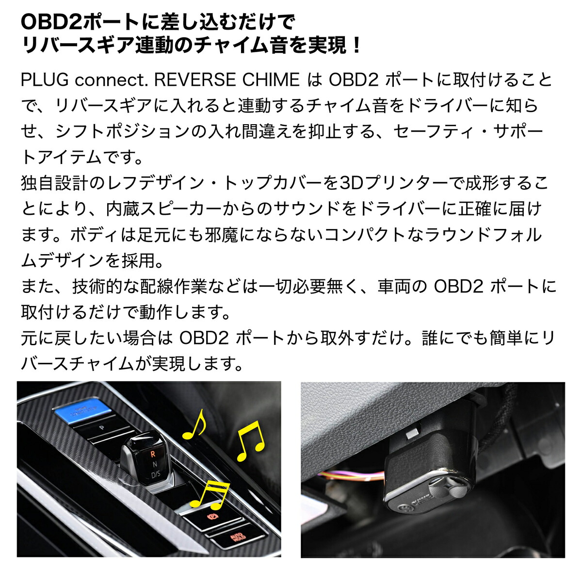※ PLUG connect. REVERSE CHIMEは、OBD2 ポートに取付けた(挿し込み)状態でご使用いただく製品です。