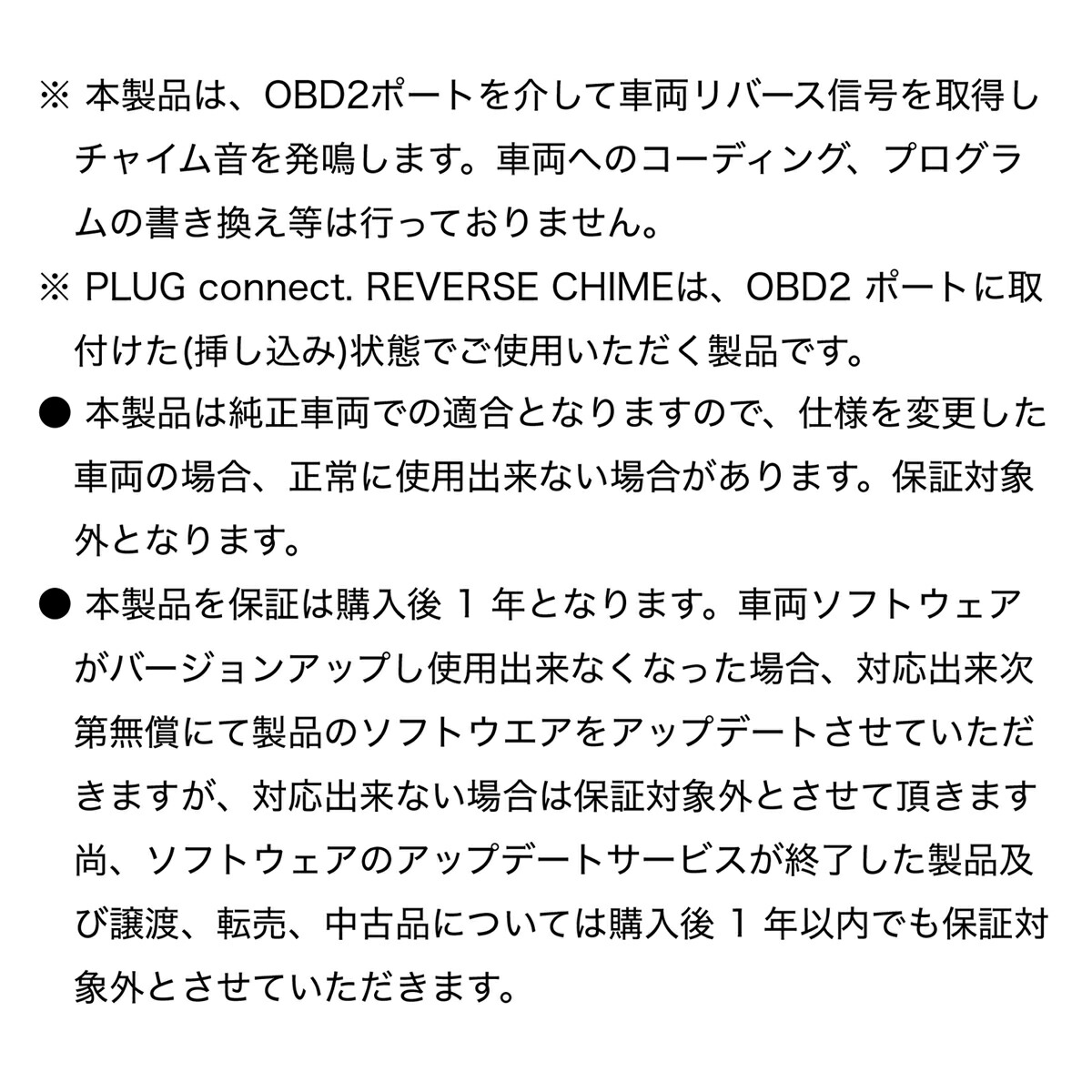 ※ 本製品は、OBD2ポートを介して車両リバース信号を取得しチャイム音を発鳴します。車両へのコーディング、プログラムの書き換え等は行っておりません。