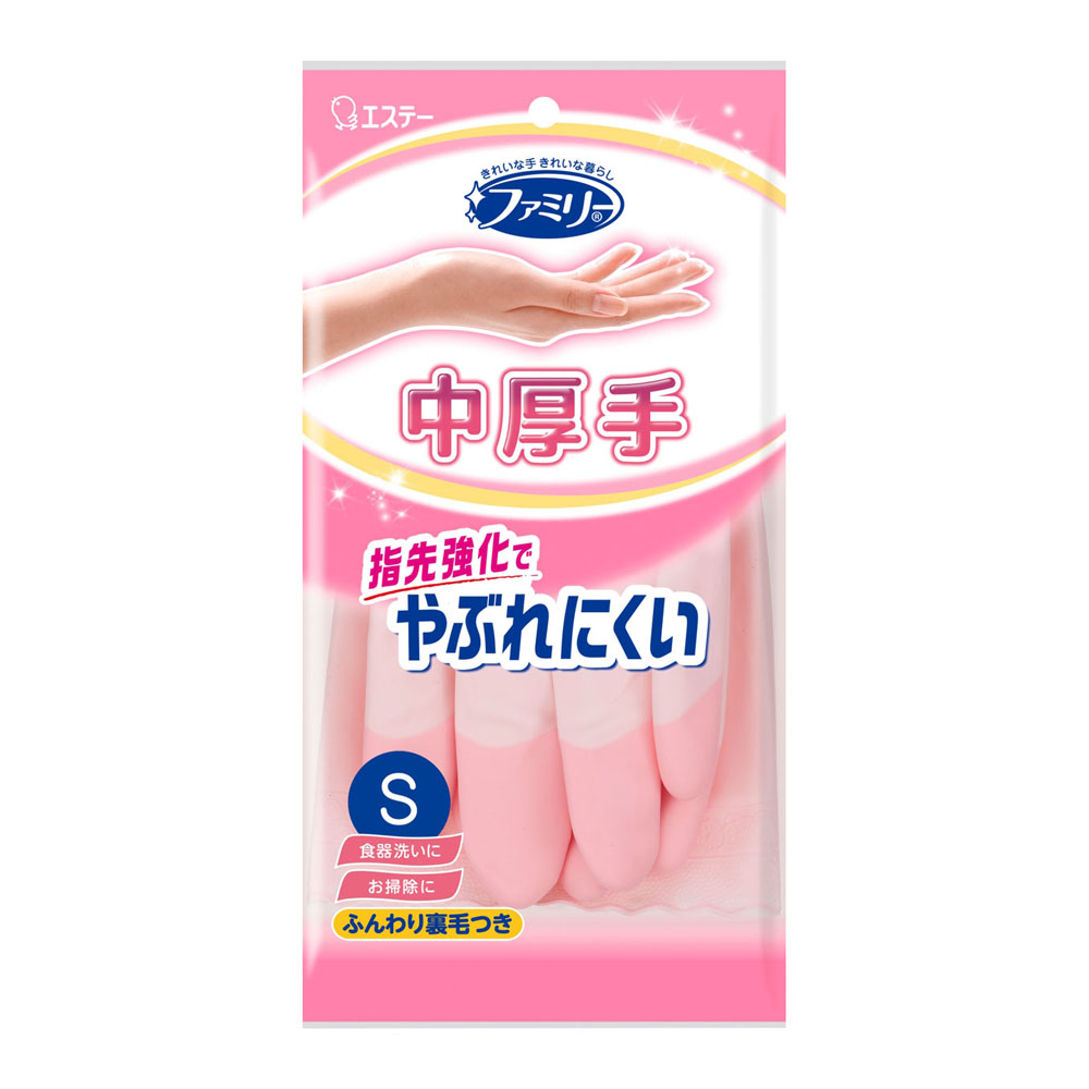ファミリー ビニール 中厚手 指先強化タイプ S ピンク (ゴム手袋 ビニール手袋 破れにくい 裏起毛 手触りやわらか Sサイズ 家庭用手袋 作業手袋 キッチン手袋 台所 洗濯 掃除 介護 エステー)