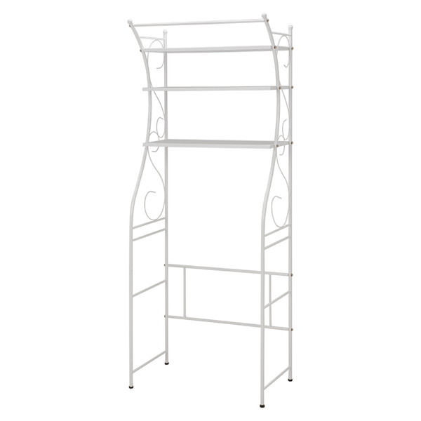 ●アイアンの曲線がエレガントで、デッドスペースを有効活用できる洗濯機ラック。上のバーは室内干しにも使えます。