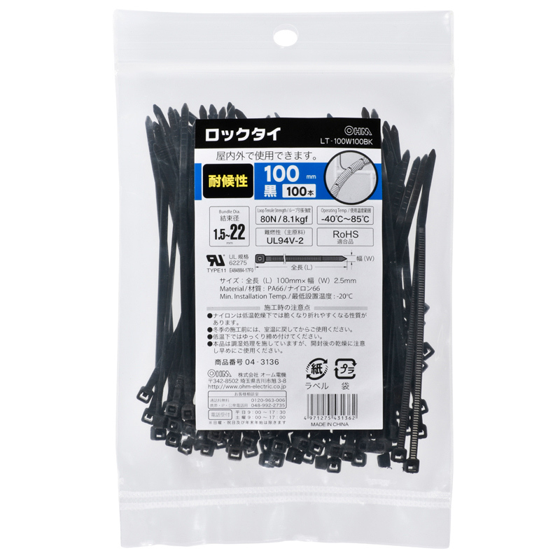 オーム電機 ロックタイ 耐候性 100mm 100本入 黒04-3136 LT-100W100BK[電線支持・結束用品:タイ・結束バンド] 爆買