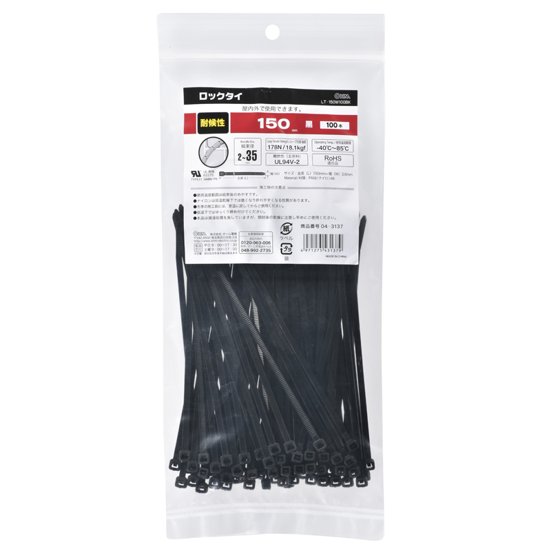 オーム電機 ロックタイ 耐候性 150mm 100本入 黒04-3137 LT-150W100BK[電線支持・結束用品:タイ・結束バンド] 爆買