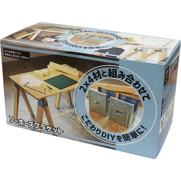 作業台作りに必要な材料:ソーホースブラケット×2セット(4個)、金具取り付け用ねじ(推奨ねじ径3.8〜4.0mm)×48本(1個につき12本)、脚用2×4材×8本、脚固定用2×4材×2本、天板×1枚
