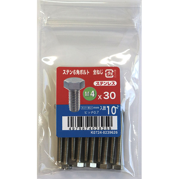 (メール便可)八幡ねじ ステン6角ボルト全ねじ M4×30 10本入