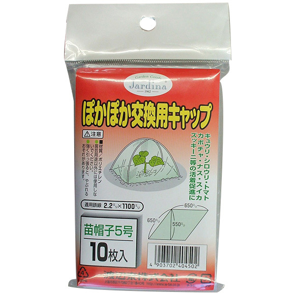 ●なぜぽかぽかキャップは野菜にいいのか。(1)寒さから苗を守る…夜間の冷気をさえぎり、霜を防ぎます。(2)苗の生育を早める…太陽の熱をたくわえます。(3)病気の発生をおさえる…雨による土のはね返りをおさえます。(4)害虫から苗を守る…アブラムシ・ウリハムシ等の進入を防ぎます。