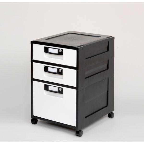 ファイル収納に最適な鍵付きオフィスキャビネット浅型2段と深型1段を組み合わせたタイプです。深型の引出しはインナーケースやA4ファイル、浅型の引出しは小物収納に最適なサイズです。引き出しやすい金属レールを採用しています。移動に便利なキャスター付きです。グリーン購入法適合商品です。