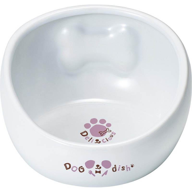 商品説明:食べる時にこぼれにくい形状の犬用陶製食器。
