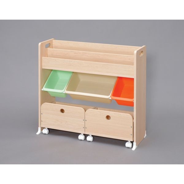 ●製品特徴:絵本やおもちゃが収納できる収納カートトイハウスラックです。絵本棚は2段で表紙を見せて収納できるので、見たい本をすぐ取り出せます。ケースは色分けされているので、「どこに何を片付ける」のルールが決めやすく、お子様の自立心をサポートし、楽しくお片付けができます。収納カートは、キャスター付きで移動が楽に行えます。安全性を考慮した前倒れ防止脚パーツ付きです。