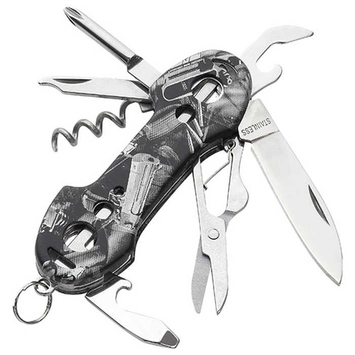 機能は缶切り・ナイフ・はさみ・爪そうじ・ヤスリ・マイナスドライバー・プラスドライバー・栓抜き・コルク抜き・キーリングです。
