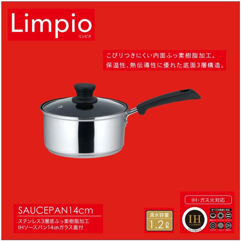 ベストコ 片手鍋 ガラス 蓋付き 14cm ステンレス 3層底 ふっ素 樹脂加工 IH 対応 ソースパン NQ-0041 リンピオ