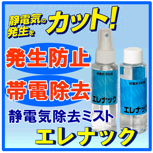エレナックは衣服の静電気対策からハイテク産業までにも使える、静電気消去と発生の予防液です。