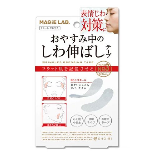 「マジラボ 細かいところもカバー お休み中のしわ伸ばしテープ No3スモールタイプ MG22117」は、ほどよく堅い医療用テープで表情筋を固定して、寝ている間中、しっかりと肌のヨレを防いでくれる、しわ伸ばしテープです。目尻のシワ・ほうれい線など細かいところのケアにおすすめ。寝る前にシワが気になる部分に貼るだけなので、毎日続けられる簡単ケア。刻まれてしまうと中々消すことが難しいシワだからこそ、毎日の生活でシッカリとケアすることが大切です。