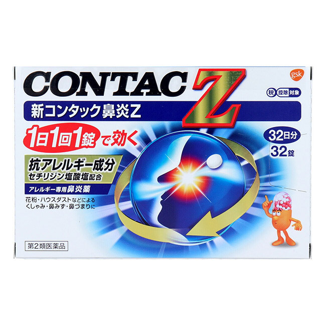 「新コンタック鼻炎Z 32錠」は、抗アレルギー成分のセチリジン塩酸塩を配合し、アレルギー症状を抑えます。セチリジン塩酸塩は、服用しても眠くなりにくい非鎮静性に分類されています。 ※服用後、乗物又は機械類の運転操作をしないで下さい。