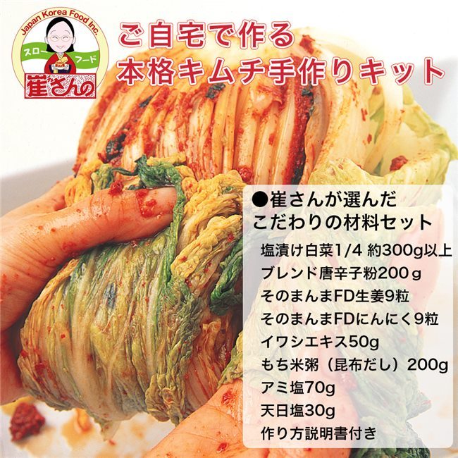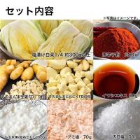 ■セット内容塩漬け白菜1/4 約300g以上ブレンド唐辛子粉 200gそのまんまFD生姜 9粒そのまんまFDにんにく 9粒イワシエキス 50gもち米粥(昆布だし) 200gアミ塩 70g天日塩 30g作り方説明書付き