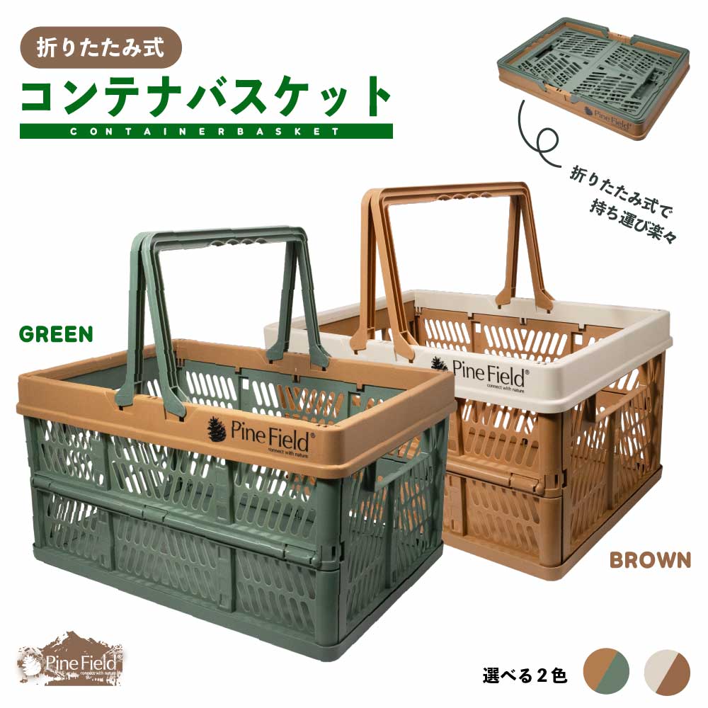 折りたたみ式 コンテナ バスケット Pine Field 取っ手付き 選べるカラー コンパクト 収納 買い物カゴ BOX ケース アウトドア キャンプ BBQ 車載 ピクニック 花見