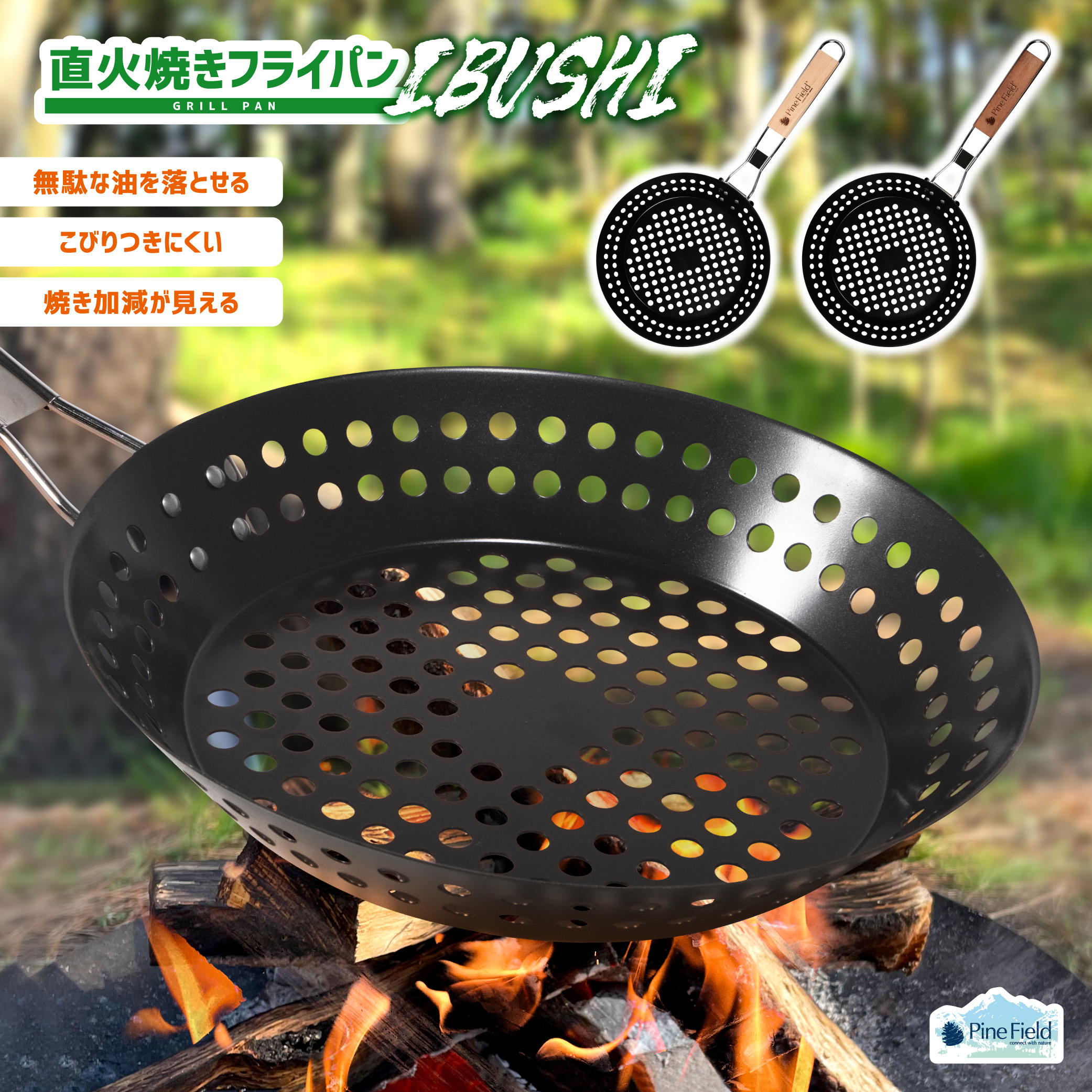 直火焼き フライパン IBUSHI Pine Field 折りたたみ式 穴あき 木製ハンドル コンパクト 軽量 キャンプ アウトドア BBQ スモーク 炭火 料理 調理 燻し 燻製