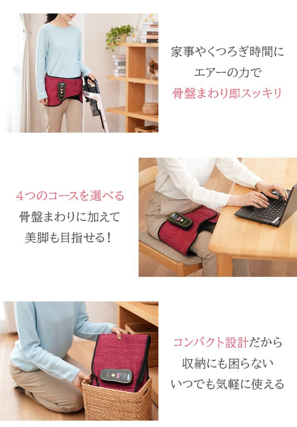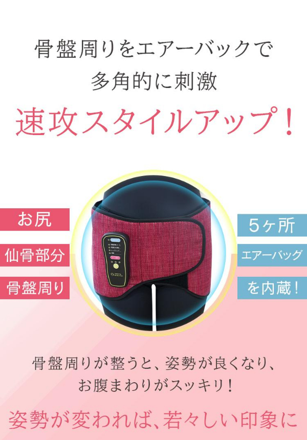 内蔵したエアーバッグが膨らんで骨盤まわりを多角的に刺激し、1回15分のケアで、心地よくスタイルアップを目指します。