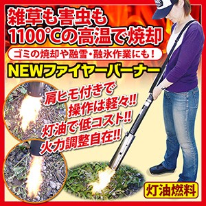 【灯油燃料使用 草焼きバーナー ニューファイヤーワイド】雑草も害虫も1100℃の高温で焼却。ゴミの焼却や融雪・融氷作業にも!草焼バーナー「NEWファイヤーワイド」●肩ヒモ付きで操作は軽々!! ●灯油で低コスト!! ●火力調整自在!! 雑草も害虫も1100℃の高温で焼却。肩ヒモ付きで軽々操作できる。【サイズ(約)】筒先開口6〜9cm×全長124cm【重さ(約)】2.5kg【材質】タンク:スチールパイプ、筒先:ステンレス、気化器:銅、肩ひも:ポリエステル【使用燃料】灯油(JIS1号灯油)【燃料タンク容量(約)】15リットル【連続燃焼可能時間(約)】50分【火炎の長さ(約)】25〜35cm【最高温度】1100℃【熱カロリー】最高29000kcal/時【付属品】掃除棒、パッキン、Oリング【保証期間】1年間【生産国】韓国【その他】賠償責任保険付【関連キーワード】NEWファイヤー ニューファイヤーバーナ ファイヤーバーナー ワイド 灯油ガス化方式 高火力草焼きバーナー 草焼きバーナー 灯油ガス 灯油 燃料 草焼き バーナー 除草作業 野焼き 芝焼き 害虫退治 除草 雑草 害虫 焼却 送料無料 おすすめ 人気 通販 販売