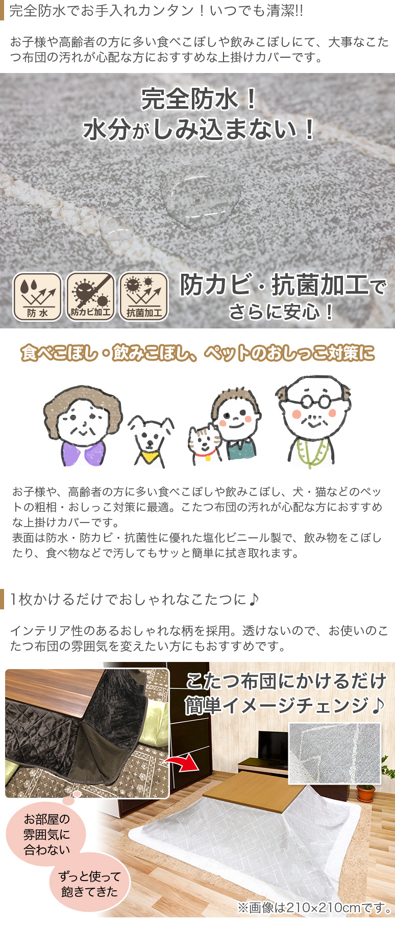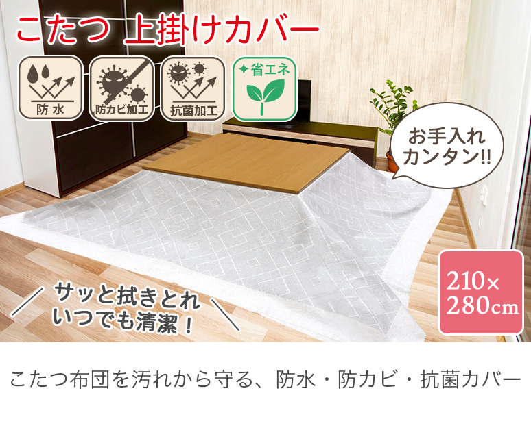 | ● ここがポイント ● 〇お子様や高齢者の方に多い食べこぼしや飲みこぼしにて、大事なこたつ布団の汚れが心配な方におすすめな上掛けカバーです。 〇表面は防水・防カビ・抗菌性に優れた塩化ビニール製です。 〇完全防水で、保温力にも優れています。 〇インテリア性のあるおしゃれな柄を採用。柄物は透けないので、お使いのこたつ布団の雰囲気を変えたい方にもおすすめです。 〇アルミ配合のPVCフイルムを使用することで、反射・断熱に効果があり、優れた保熱効果を発揮します。 〇塩化ビニール製により、ペットのおしっこ対策にも効果的です。 |