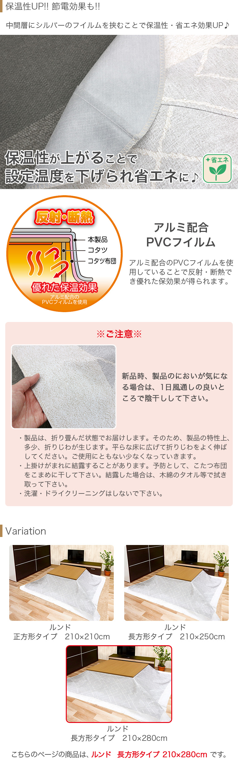| ※ 注意事項 ※ ※新品時、製品のにおいが気になる場合は、1日風通しの良いところで陰干しして下さい。 ※上掛けがまれに結露することがあります。予防として、こたつ布団をこまめに干して下さい。 ※結露した場合は、木綿のタオル等で拭き取って下さい。 ※洗濯・ドライクリーニングはしないで下さい。 |